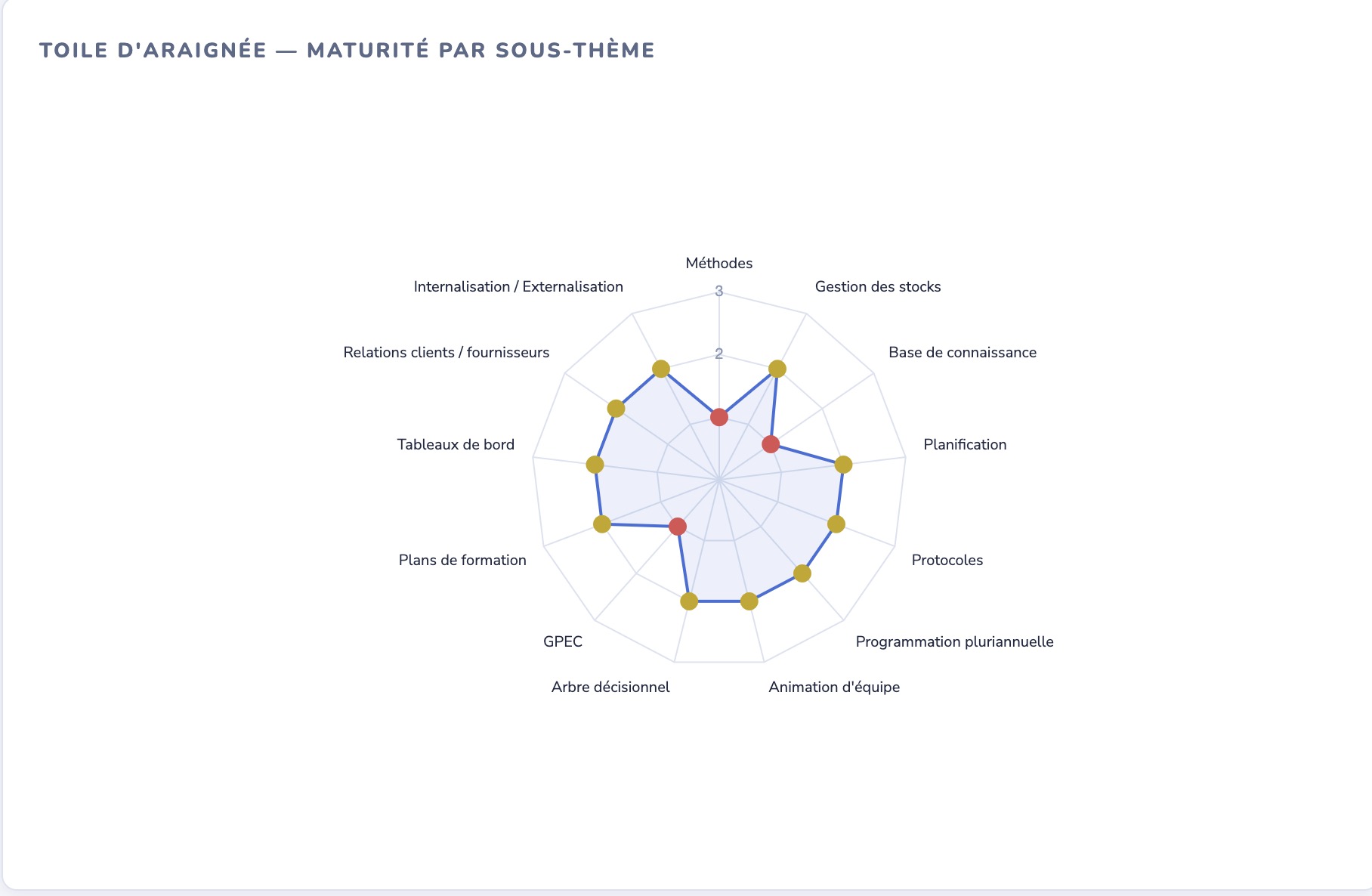 Le présent outil permet aux responsables d’évaluer par une série de questions simples (réponses oui/non) le degré de maturité de leurs organisations sur chacun des 3 axes et d’ainsi pouvoir objectiver dans l’absolu mais également de manière relative (issue d’une moyenne du panel d’un pilote) tant les points forts que les leviers d’amélioration possibles :
